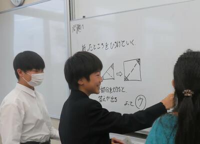 体験授業では、教職員も在校生も、「約半年後に一緒に学ぶ仲間になるのかな…」という思いを抱きながら小学校6年生をお迎えしました。仲間と真剣に課題解決に向けて、対話をしながら「学び合う」、本校のスタイルはいかがだったでしょうか。中には自ら手を挙げて自分の考えを述べる小学校6年生もいて大変立派でした。これから、入試に向けて、学習にも一層力が入るかと思いますが、小学校生活で仲間と豊かな人間関係を築くこと、協力してやりきるという経験も充実させてください。その力が本校の学校生活の土台となります。
