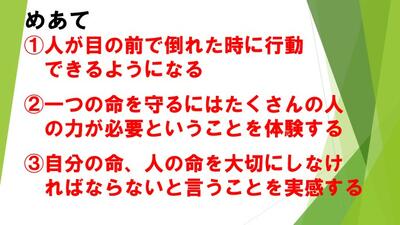 ・一度中学校の時に救急法を学んだが不安だったので、今回学べてよかったです。心肺蘇生の際には、少しでも助かる確率を上げるために声をだし、周りと協力することが大事だと思いました。
