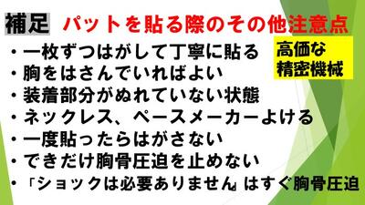 ・貼る際の注意点:プライバシーを可能な限り守りながら対応、AEDの音が聞き取れるように周りを静かにさせる。