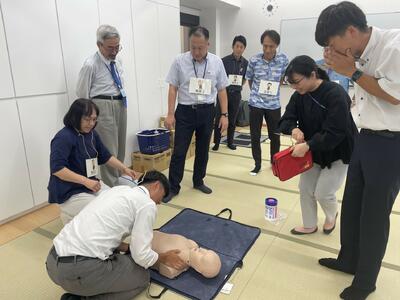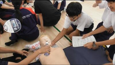川口市立高校と附属中学校は毎年7月は救急法スキル強化月間です。実は中高の全教職員が今年も7月1日~7月3日の3日間、救急法講習会で訓練をしました。生徒も教職員も一緒の時期に救急法を学び、校内全体で意識を高めることができています。