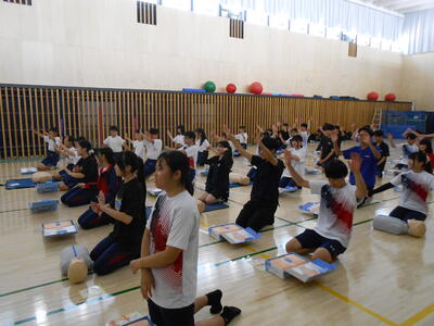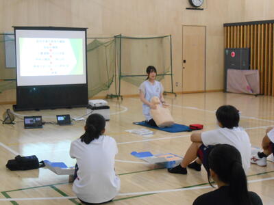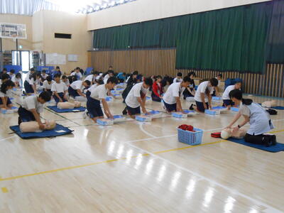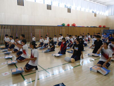 令和8年1月19日(月)、4・5時間目の保健体育の授業内において、第5回学校保健委員会「救急法講習会」を開催しました。対象は中学2年生です。本講習会は、本校1期生の時から毎年継続して実施している取組であり、命の大切さを学ぶとともに、一次救命処置に必要な知識と技能を身に付けることを目的としています。