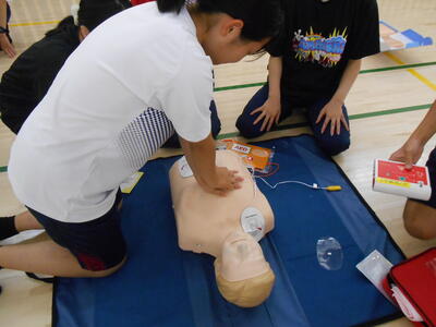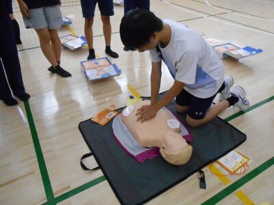 「講習でできた気になってもいざ目の前で人が倒れたら、頭が真っ白になってしまって動けないかなと思ってしまった。日ごろからAEDの位置を見ておいたり、部活中に急病人が出た時には、どう救助をするか、消防隊員が来た時の経路をどうするべきなのかを先に考えておくことが大切だと思った。緊急時にも対応できるようにしたい。」とのことでした。