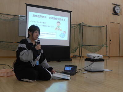 講演ではキャラクターやスライドを使った説明が分かりやすく、楽しみながら多くの学びを得ることができました。保健委員の発表や体験活動も、現状を知るだけでなく、自分にできることを考えるよいきっかけになりました。中学生の今こそが成長に必要な時期。日々の食事や生活習慣を大切にし、今日学んだことを少しずつ実践に移していきたいです。