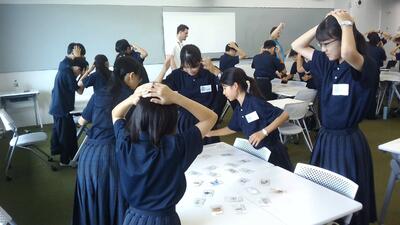 第1種目はマイネームチェーン!声を出すことなく学年全員で名前の順になります。その後、生徒IDを大きな声で発表し、元気よく答え合わせをすることができました。答え合わせの後は自己紹介タイム。お互いにどんどんコミュニケーションをして、理解し合えるようになるといいですね。