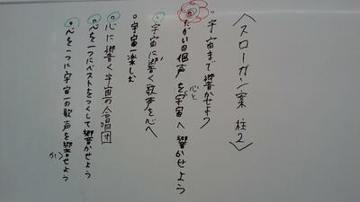 先日の学年集会での先生方のお話を受け、「目標」と「目的」、「スローガン」の違いを共通認識として確認しながら、話合いが進められていたところが素晴らしかったです。たくさんの意見が出され、議論や多数決の中で消えていった言葉、文章もありました。しかし、話し合いの中で交わされた仲間の想いは、全員が聞いていたはずです。それぞれの想いを大切にし、丁寧に歌に込めながら、クラスの合唱を作り上げていってくださいね