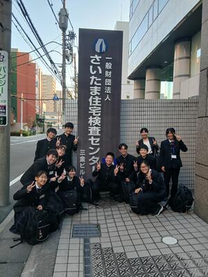 午後は埼玉県に戻り、一般財団法人さいたま住宅検査センターへ。建物の安全を守るお仕事について、私たちにとっては新たな視点から学ばせていただきました。建築確認の実習では、数学で学習したことを生かして「基準通り」と判断していました。
