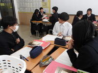 授業の初めは班の中で”少年派”と”少女派”に分かれて意見を戦わせていました。