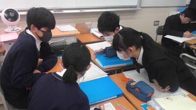 生徒は中学1年生3学期に凸レンズの特徴について学んだため、凸レンズと同じはたらきをもつ水晶体を文字の上において大きくなることや、遠くの景色が逆さまになって見えることも確認しました。これまでの学びと学びがつながる瞬間でした。