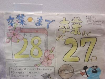 学年全員が1人1枚、「卒業式まであと何日」そして、3期生へのメッセージを書いたカレンダーを作り、廊下に1日ずつ貼って更新しています。