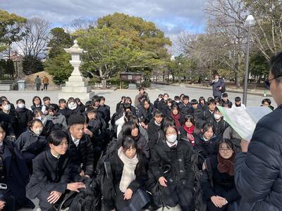附属中生貸切の市電に乗り、原爆ドーム(世界遺産)、平和記念公園に到着しました。