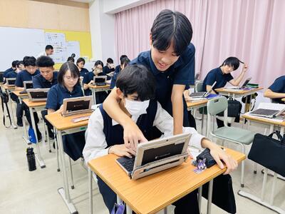 今日はそれぞれの担当する神社や寺院などについての調べ学習を行いました。他クラスの生徒とペアになり協力して1つの資料を作成しました。