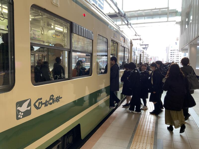 附属中生貸切の市電に乗り、原爆ドーム(世界遺産)、平和記念公園に到着しました。