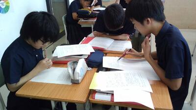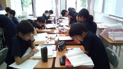 中間発表会に向けて、夏休み中に立てたリサーチクエスチョンを解決するために、どのような方法を用いるのか、先行研究をもとにどのような仮説をたてたのかをパワーポイントにまとめる作業です。発表会に向けてより探究意欲を高められるとよいですね。
