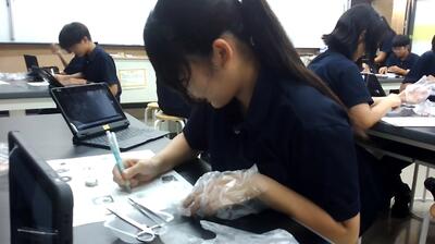 豚の眼球を単体で見ることが初めての生徒が多く、興味と緊張が入り混じっていた様子でしたが、真剣な表情で実験を進めていました。