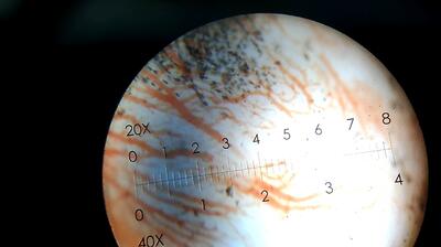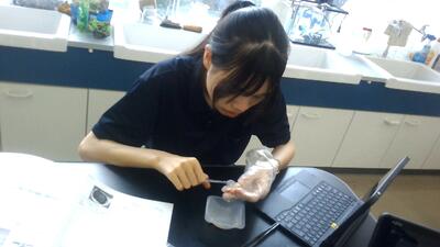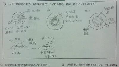・強膜は思っていた何倍も硬くて、はさみを10回くらい入れないと切れなくて、この膜が眼球を守っているんだと実感しました。水晶体を通して景色を見ると逆さまに見えました。0.6mm以上離すと上下左右逆の実像が見えて、それより近いと文字がそのままの向きで大きく映る実像が見えました。