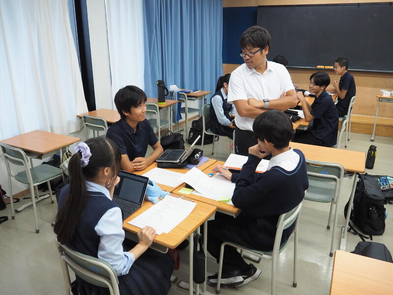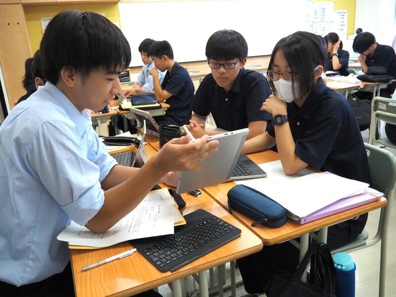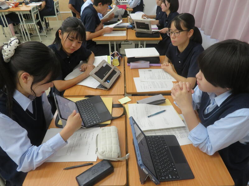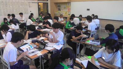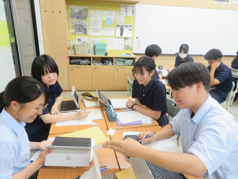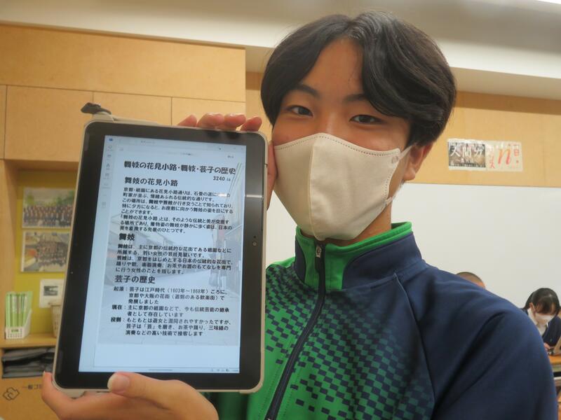 今日はそれぞれの担当する神社や寺院などについての調べ学習を行いました。他クラスの生徒とペアになり協力して1つの資料を作成しました。