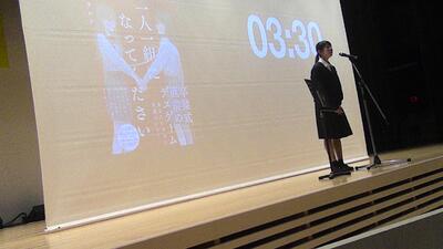 ビブリオバトル校内代表決定戦が、全校生徒&多くの教職員観戦のもと大ホールにて開催されました。12月に開催される県大会に附属中学校から出場できる2名の枠を勝ち取るため、各学年熾烈な予選会が行われてきました。予選を勝ち抜いた4名による本の紹介合戦、多くの生徒が固唾をのんで見守る中、代表生徒2名が決定しました!